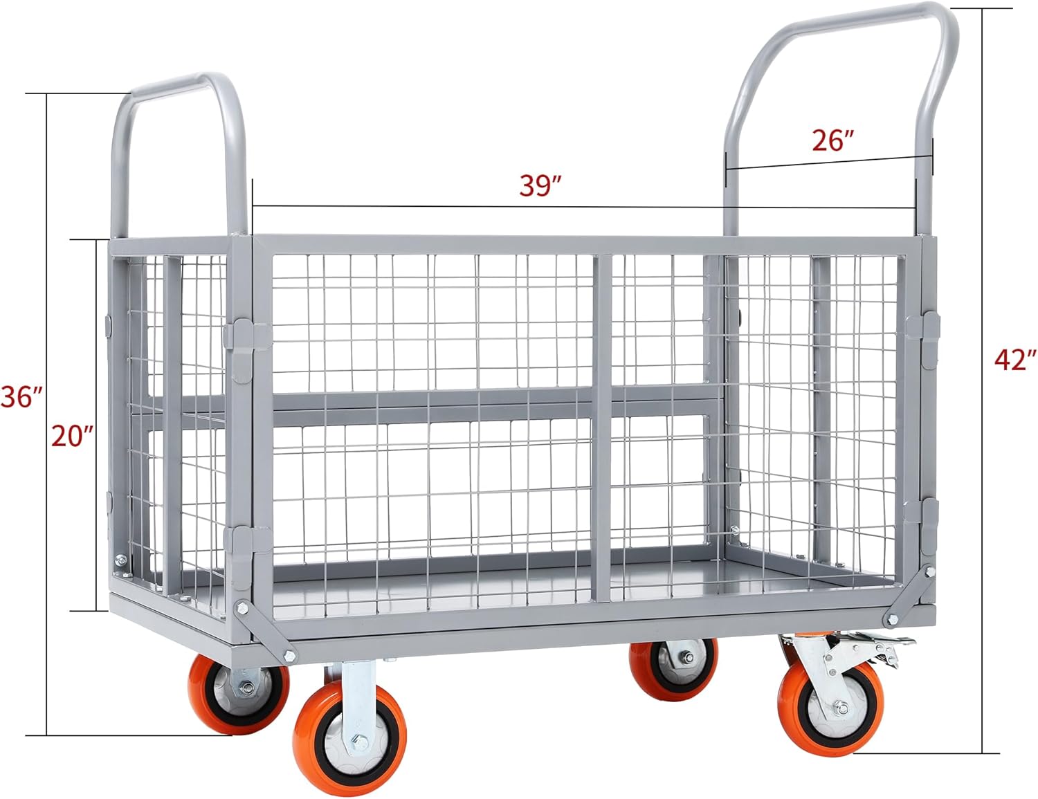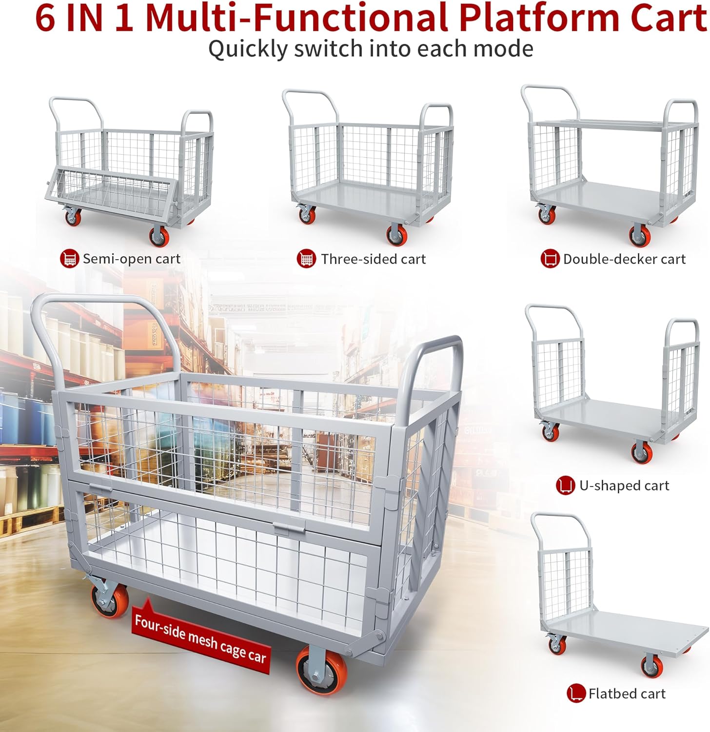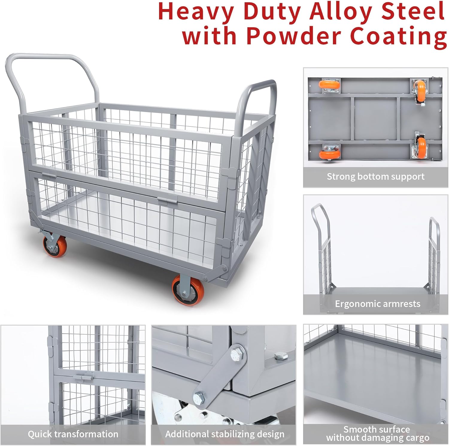 Why buy multiple carts when one can do it all? The innovative adjustable cage design allows you to switch between six distinct configurations: a flatbed cart, a semi-open cart, a three-sided cart, a fully enclosed four-sided mesh cage, a double-decker cart, and a U-shaped cart. This adaptability makes it perfect for securing loose items like buckets and balls or flattening out to accommodate bulky boxes and furniture.