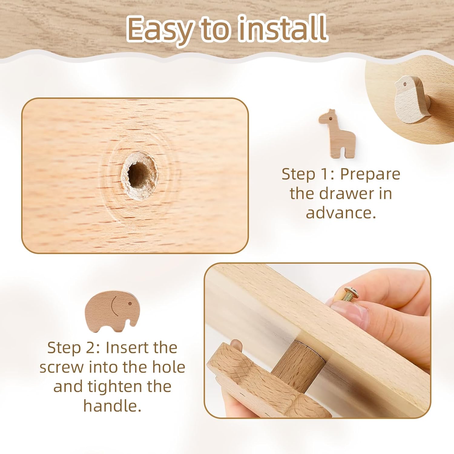 Transform your furniture into a whimsical woodland adventure with the Youuys Wooden Animal Cabinet Pulls. Expertly crafted from high-quality, durable wood, these knobs are designed to withstand the rigors of daily use while adding a touch of natural charm to your home décor. Each piece in this 12-set collection showcases a unique, hand-sanded animal shape—including a brown bear, panda, whale, rhinoceros, alpaca, giraffe, and bird—retaining the organic grain and texture of the material for a rustic, minimalist aesthetic.