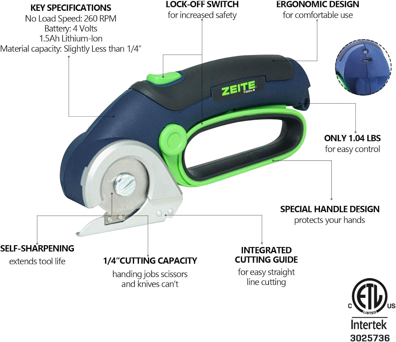 • POWERFUL CORDLESS CUTTING: 4V motor spins at 260 RPM to slice through 1/4″ cardboard, carpet, fabric, and plastic with ease.