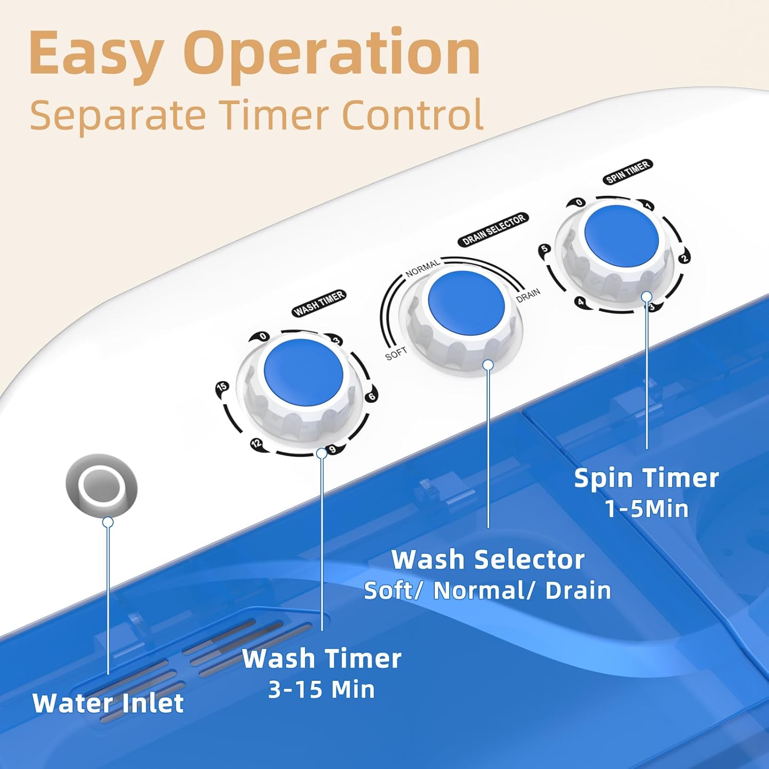 - User-Friendly Controls: Simple 3-knob control panel allows you to easily customize wash time (0-15 mins) and spin duration (0-5 mins) for different fabric types.