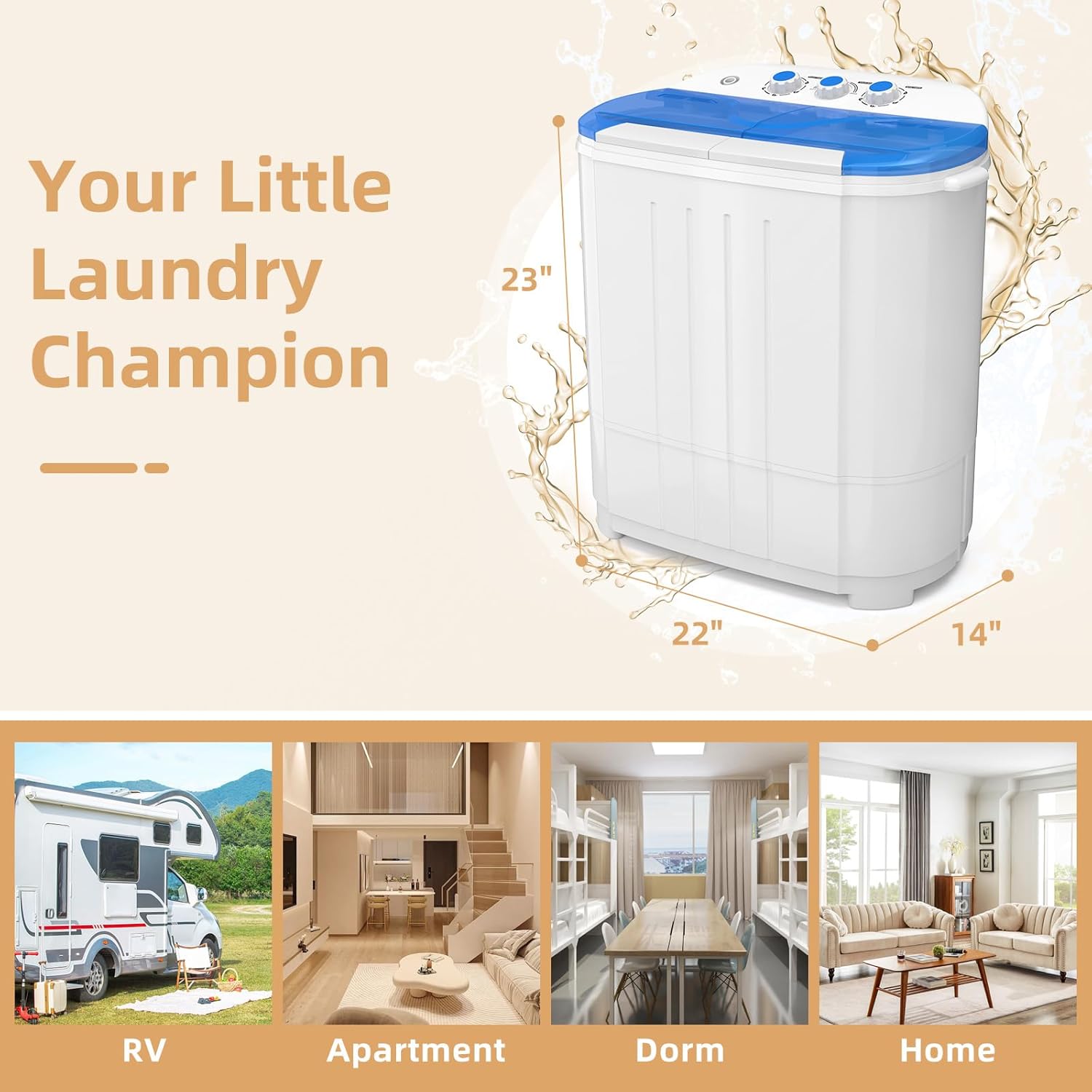 - Compact & Portable: Weighing only 22Lbs with a space-saving profile (22″ x 14″ x 23″), this washer is ideal for tight spaces like dorms, RVs, and apartments.